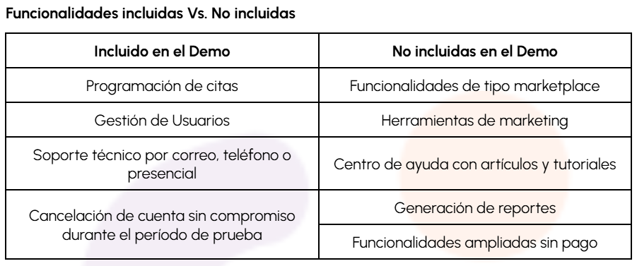A continuación, se presenta una tabla que detalla de manera clara y estructurada las funcionalidades incluidas y no incluidas en la versión Demo de la plataforma, con el fin de brindar una comprensión precisa del alcance del servicio en su etapa de lanzamiento
